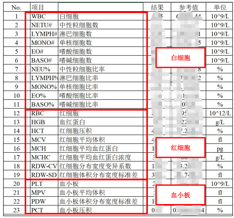 拿到血常规报告后,我们可以先简单的将其分为三大板块,这三大板块分别反映红细胞、白细胞和血小板情况,各大板块我们仅需关注几项重点项目。