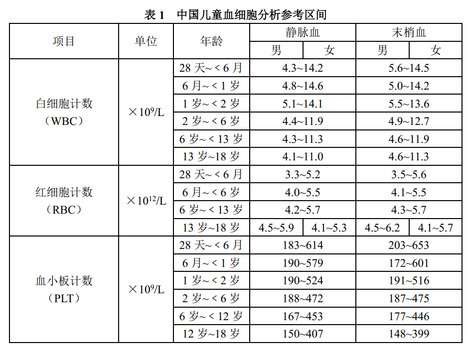 同时,儿童的血细胞计数与成人有明显的不同,血细胞计数结果随年龄增长有明显变化。部分非儿童专科医院检验报告上的参考区间是成人的,孩子做了检测后报告上出现很多箭头,这个时候家长千万不要惊慌,可以参考《儿童血细胞分析参考区间》进行报告解读,这是国家卫健委专门针对年龄在28天-18岁中国儿童发布的,里面对不同年龄阶段的孩子的血细胞分析参考区间进行了详细的规定,家长们可以对照孩子的年龄来寻找相应的参考区间。