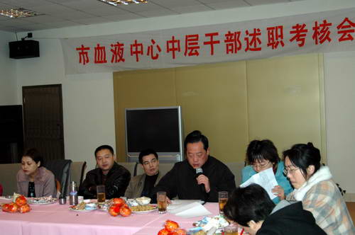 2006年1月20日,血液中心召开了05年度中干述职会。会上,中层干部们总结了过去一年的工作、提出了经验与不足,并对06年的工作进行了部署。会议由中心党委副书记刘迤同志主持,中心主任王乃红对中层干部一年的工作进行了评价,她认为这一批干部充满活力,工作中积极进取,敢于创新,办事讲效果、重合作,起到了良好的带头作用。最后,党委书记尹丹妮对述职考核会作了总结,肯定了中干们一年的工作成绩,对明年的工作提出了新的希望,要求大家再接再厉,团结协作确保血液安全,保证临床用血。