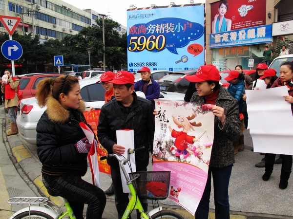 星期六,天气寒冷,忙碌了一周的人们都在休息,街上比较安静。但是严寒挡不住支部党员的热情,大家一大早就赶到中心大门口集合,统一乘车来到华阳镇最繁华的第V大道广场,戴穿好无偿献血宣传志愿者小红帽和红背心,拉开 “捐献可以再生的血液、拯救不可重来的生命”无偿献血宣传月活动主题横幅,走向人群,向他们发放无偿献血宣传资料和新台历、年历,并向他们宣传无偿献血知识,讲解用血优惠政策,宣传效果较好,很多人听了我们的宣传后就问献血时间、地点、优惠规定等,也许是马上要到新年了,我们新印制的无偿献血台历、年历非常受欢迎,市民们争先恐后领取。当天发放无偿献血资料300余份,台历、年历各100个。