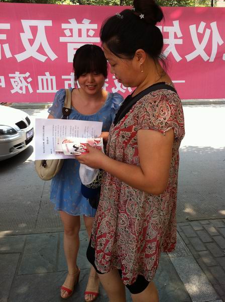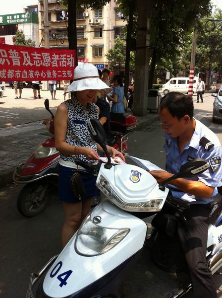 重自觉。建设文明、美好、和谐的大家庭,需要每一位公民的积极参与,共同努力。我们要做到自觉、自律,养成讲文明、重礼仪的良好习惯。” 大家积极的配合,3人一组分成几个团队,将宣传资料不断的发给过往的人群;有的市民热情的接过资料,细心阅读起来;有的只是微微一笑;有的主动过来取资料;当然也有的会摆手拒绝,我们的党员也不怕,会拿着资料反复介绍文明礼仪知识,直到他们离开……,今天天气虽然很热,但是从拿到的资料中津津有味读起来的市民脸上的表情,看得出他们对成都市逐渐形成的礼仪和文明感到一丝的欣慰,我们都会心的笑了。这次活动中,作为血液中心的一分子,我们也积极倡导市民参加无偿献血活动,耐心细致给市民讲解无偿献血的注意事项,派发无偿献血知识手册和小纪念品。通过宣传,市民在认知礼仪知识普及的过程中自身文明素质和修养也得到了提高,同时也对无偿献血事业有了更为深刻的理解,为创建文明城市奠定了坚实的基础。