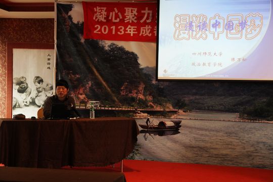 2013年5月7/9日,我中心邀请了四川师范大学政治教育学院陈万松教授为中心全体职工作了一场解读中国梦的讲座。陈教授从“中国梦的内涵”、“提出中国梦的意义”、“中国梦的具体目标”、“实现中国梦的途径”,以及“实现中国梦从每个人做起”等多个层面谈了自己的见解。陈教授和蔼热情循循善诱,既如数家珍,又旁征博引;既有深厚的理论支撑,又有具体真实的数据事例,把一个非常宏大的专题解读得真实、丰富、可感,深深感染着在座的每一个聆听者!