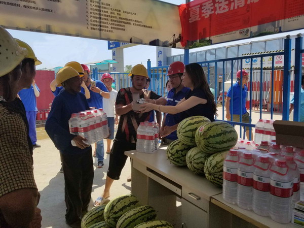 活动现场,中心党委书记米虹同志,中心党委委员、中心副主任邹雪川同志向施工人员发放了藿香正气液、清凉饮料、西瓜等防暑降温物品,并嘱咐他们在工作时要多饮水,注意防暑降温,同时感谢他们在酷暑天气仍然坚守施工一线,希望他们能够注意施工安全,严守施工工艺,保证工程质量。这些防暑降温物品真切表达了中心对施工人员的关怀。在场的施工人员都纷纷表示收到这些防暑降温物品,非常开心,也很感动,天气虽然炎热,但一定会克服困难,保质保量建好“新血站”。