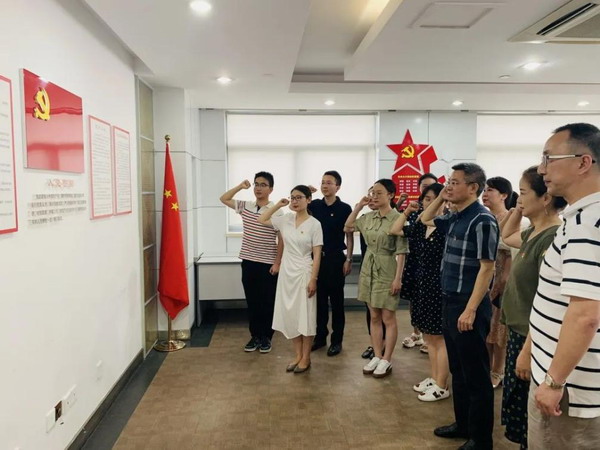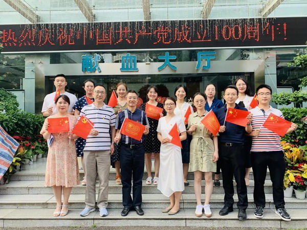 首先,市卫健委办公室副主任查秋潇一行与中心业务一支部党员就上半年的党史学习情况、基层党建心得、新血站建设、采供血服务网络健全、疫苗接种等多项卫生健康工作进行了深入交流和探讨。接下来,查秋潇同志领誓,全体党员干部面对党旗,重温入党誓词,向党和人民表达忠诚的决心。中心党委委员、副主任李文代表全体与会人员,献上对党最诚挚的祝福。最后,委办公室党支部党员用撸袖献血的实际行动诠释共产党员“乐于奉献、敢于牺牲、坚贞不屈、始终不渝”的革命信念。