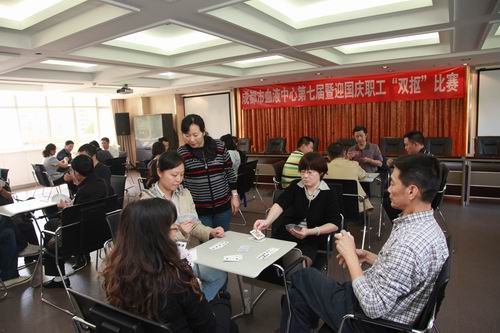 为迎接国庆节的到来,我中心工会于2011年9月29日下午在六楼多功能厅,举行了成都市血液中心“迎国庆暨第七届职工‘双抠’比赛”。