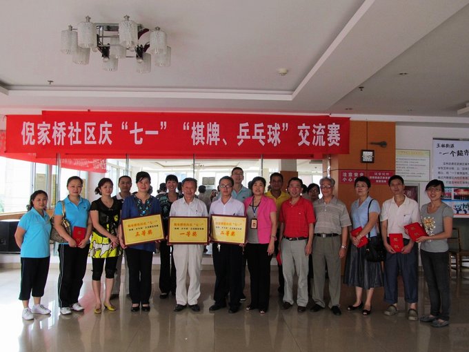 6月19日上午,我中心派出由9人组成的代表队,参加了玉林街道倪家桥社区庆“七一”“棋牌、乒乓球”交流赛。本次比赛的目是倡导全民健身理念,活跃社区群众文化生活,加强单位和居民间的相互沟通和交流,共建文明和谐社区。