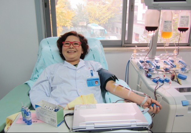 今天是她光荣退休的日子,和往常一样,杨老师早早来到机采室填好献血征询表。“虽然以后离开这个岗位了,但不代表我就离开献血者的队伍啊”!她利索的挽起衣袖,爽朗的说笑着!是啊,这些年来她一直坚持在血液最紧张的时候参加血小板的捐献,帮助了不少需要帮助的人!不仅是她自己,还带动了她的家人、她的朋友加入到固定捐献血小板的志愿者队伍中来,为缓解医院临床用血压力做出了努力!这次,她依然选了靠窗户的位置完成血小板的捐献,窗外,冬日金黄的银杏树叶在阳光下美得格外耀眼,她灿烂的笑容也丝毫不逊于窗外的美景,那是开心的笑容、那是满意的笑容,那是因为帮助别人而发自内心的自豪的笑容!
