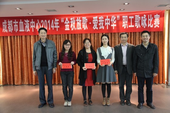 “正宗好工会,正宗好声音,欢迎大家参加由成都市血液中心工会为您举办的中心好声音之“金秋放歌・爱我中华”职工歌咏比赛。你可以鼓掌,或者呐喊以及尖叫你喜欢的学员名字参与节目互动,还可以手舞足蹈观看节目的精彩内容,或手持你们的三星、小米、iphone进行现场录音,留下您最喜欢的歌曲彩铃……”,借用《中国好声音》主持人华少的经典台词,成都市血液中心工会举办的“金秋放歌・爱我中华”2014年职工歌咏比赛“登场亮相”了。