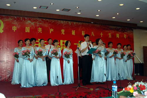 由六个党支部组队的科室党员和群众组成的参赛队,进行了庆 “七.一”歌咏比赛,并由各支部推荐的一名评委进行打分评比。歌咏比赛始终充满着歌颂中国共产党、歌颂祖国、歌颂“八荣八耻”等,通过一曲曲充满对党、对祖国深情的表演,不时博得场下阵阵的掌声!最后经过评委评比,业务一党支部获得一等奖,行政党支部、业务二党支部获得二等奖,业务三党支部、后勤党支部、获得三等奖。