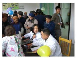 (3月5日,我们到邛崃鱼坝村为农民朋友义诊,并做无偿献血宣传,受到当地群众的热情接待。我们挂起“学雷锋、开展无偿献血宣传”和“一人献血、全家受益”横幅,摆起桌子,开始为农民量血压、听心肺、查血型、称体重,发放无偿献血宣传资料和气球,讲解无偿献血宣的意义、血液知识等,并进行健康知识宣传。农民朋友们把我们围得水泄不通,对我们的体检和宣传非常满意、高兴,他们连声向我们表示感谢。图为党委书记尹丹妮为农民朋友义务体检。)