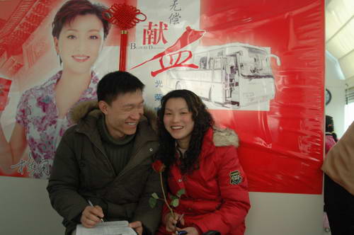 昨日,在成都的锦江爱心献血屋,一半以上的献血者都是夫妻或年轻的情侣。一大早,年旬50的唐德芳就和丈夫携手来到献血屋,第一次参加无偿献血的她说,结婚二十多年,从未和丈夫过过情人节,这次打算用献爱心的方式来过一次情人节。廖谧是成都市血液中心的职工,昨天也和丈夫冯松一起来参加无偿献血。冯松笑着说,“一起来献血过情人节既奉献了爱心,又支持了爱人的工作,这比送她什么更好。”李光荣和苟晓燕等四对夫妻则是带着孩子一起来献血,他们纷纷表示,一起献血来过情人节,向社会奉献自己的爱心很有意义,带着孩子来,虽然孩子尚幼,还不能献血,但给他们树立了榜样,教育了他们要有爱心,要有奉献精神。而在一家娱乐公司上班的史勇红在情侣、夫妻相约来献血的人群中略显孤单,他说独自一人前来是要回去给女友一个惊喜,“如果对社会没有爱心,怎么保证对自己的爱人有真爱呢?我要以这种方式告诉她,她未来的丈夫是值得依靠的。”