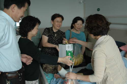 昨日下午下班后,刚刚开完会的成都市血液中心领导和中层干部代表一行六人前往415医院外科住院部,慰问了公民献血科职工徐娅玲的母亲,带去了牛奶、水果及全中心职工的深情厚谊,徐母是在江油地震中手脚以及胸部被屋顶上的预制板砸伤,第二天被家人送往成都的,徐娅玲知道消息后仍然坚守在工作岗位上,直到下班才赶往医院。徐母对中心领导的慰问非常感激,并要求徐娅玲上好班,为抗震灾区努力工作。随后领导们又去慰问了职工郭沁川的父母,郭的小弟弟因公在地震中牺牲。中心领导的亲切慰问使郭沁川和她的父母感受到了组织的温暖、人间的真情。