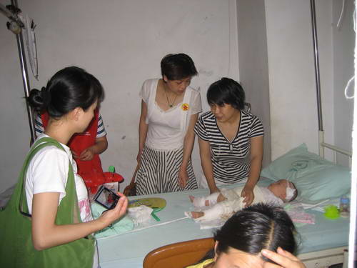 6月3日下午,血液中心工会副主席张杰、行政支部书记周健和业务二支部支委高加良,团总支书记刘飞以及志愿者等10余人,来到成都市儿童医院,慰问来自什邡、棉竹等在“5•12”地震中受伤的儿童,向他们的父母了解孩子的病情,为每个孩子送去儿童书籍、学习用品和玩具,安慰他们在这里安心治疗,祝他们早日康复。孩子和他们的父母说政府和医院对我们太好了,今天血液中心又来慰问,送来慰问品,我们太感谢你们了!