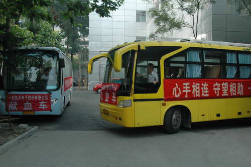 工会干事、领队王佳告诉笔者,“5.12”地震牵动了公司全体职工的心,两天公司职工捐款56万,5月13日公司就与成都市血液中心联系,希望能派采血车到公司来,大家献血献爱心,由于当时成都献血人太多,中心让我们参加了预约登记。前天接到血液中心的献血预约通知后,当即公司职工有340多人积极报名献血。刚刚献完血的职工陈林兴奋地说,我不能到第一线参加抗震救灾,但我可以献血尽一点自己的力量,支援灾区人民。