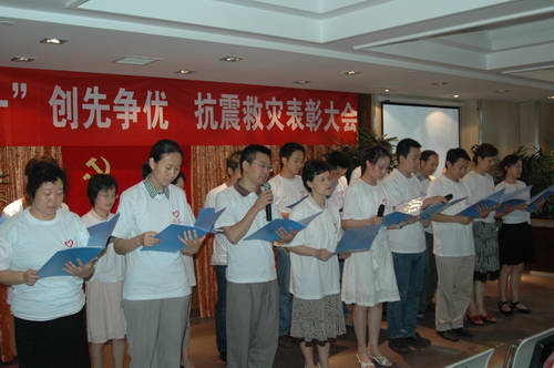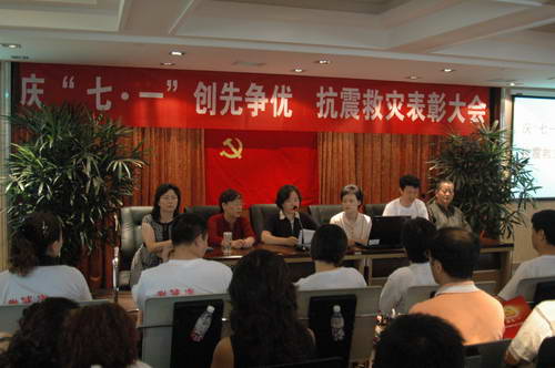 2008年6月30日下午,血液中心党委在新竣工的业务大楼学术厅,召开了“庆‘七、一’创先争优、抗震救灾表彰大会”,中心全体党员和职工代表参加了会议。