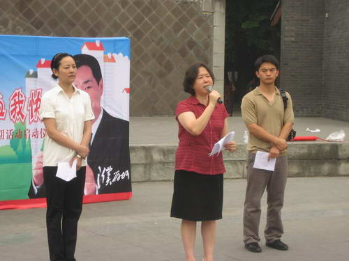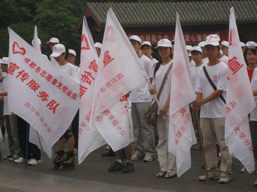 7月13日,成都市无偿献血宣传服务队在人民公园广场举行了暑期活动启动仪式。成都市血液中心党委书记尹丹妮、团市委志工部副部长宁可和成都信息工程学院团委书记丁云等出席了仪式。尹丹妮书记讲话高度评价了志愿者在无偿献血工作中的成绩和在抗震救灾中发挥的积极作用,希望大家再接再励、进一步作好工作。宁可部长宣布活动启动。