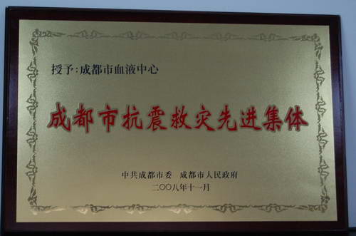 5月12日汶川特大地震发生后,成都市血液中心迅速反应,积极行动, 采取各种有效措施保证了伤员救治用血。因在抗震救灾中的突出表现,成都市血液中心集体和个人先后荣获了国家、省、市三级表彰。