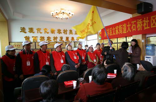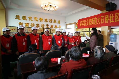 12月1日,在第23个国际志愿者日来临之际,青羊区大石桥社区的农民朋友们迎来意义非凡的一天。全国第一个城乡一体化建设中的新农村的“红色爱心”志愿者无偿献血宣传服务队在大石桥社区会议室正式成立。十三位志愿者接受了成都市血液中心党委书记尹丹妮、大石桥社区党委书记秦少宣的授旗,及成都市无偿献血宣传服务队队长刘飞的授牌。