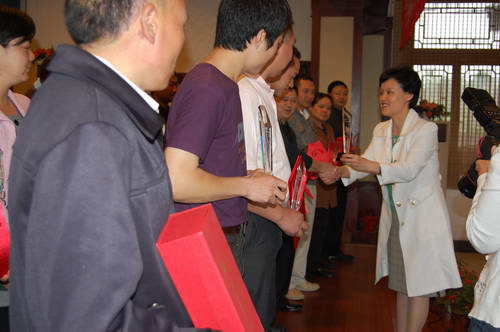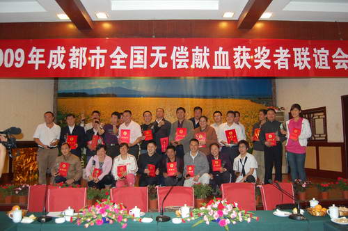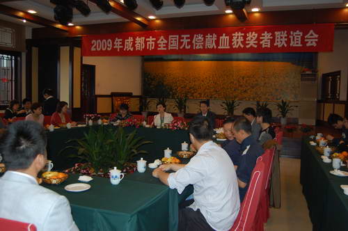 4月18日,“2009年成都全国无偿献血获奖者联谊会”在成都市三圣乡名雅山庄会议室隆重召开。获得2006-2007年度全国无偿献血奉献金、银、铜奖部分获奖者、无偿献血宣传服务队分队代表、机采血小板捐献者代表近100人欢聚一堂,成都市血液中心主任王乃红、副主任杨群身等领导出席会议并讲话。