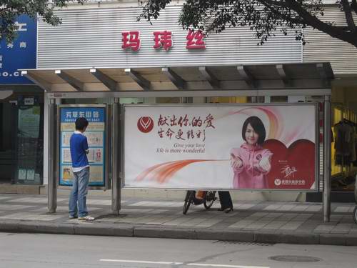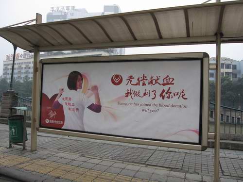 为了进一步推动无偿献血事业的发展,普及公众对无偿献血知晓率,成都市加大了宣传力度,在成都市春熙路商业圈投放了3处无偿献血公益广告,多达450平方米。而在整个一环路、红星路、人民北路、羊西线、茶店子等主要街道的公交车站亭广告牌上都投放了无偿献血公益广告。