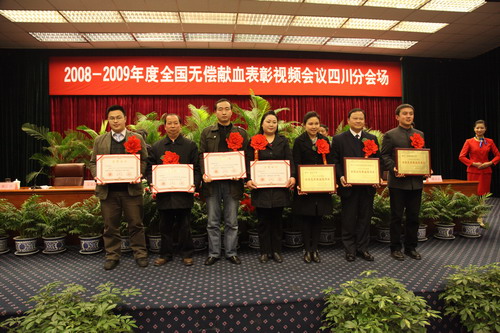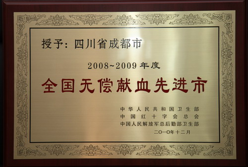 在卫生部、中国红十字总会、解放军总后勤部卫生部召开的2008―2009年度全国无偿献血表彰会议上,成都市再一次获得全国无偿献血先进城市奖,这是我市连续6年三届荣获该奖项,同时成都市分别有107人、23人和36人获得无偿献血奉献金、银、铜牌奖。此次无偿献血表彰,四川省首次荣获无偿献血先进省殊荣,218人获无偿献血奉献奖金奖,127人获无偿献血奉献奖银奖,667人获无偿献血奉献奖铜奖,11人获无偿献血造血干细胞奉献奖,四川宜宾五粮液集团有限公司、四川南格尔生物医学股份有限公司医用器具分公司、四川大学、西南科技大学、成都市血液中心5个单位获无偿献血促进奖。