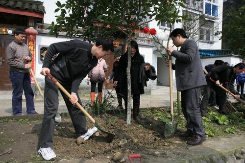 春色盎然,天气由寒转暖。杨群身书记带头拿起铁锹,与中心党员干部、职工们一起投入到植树活动中。大家你一锹我一铲,你刨土我浇水,在红火社区每家每户的院门前栽下了棵棵桂花树,只待来年成长出一片绿荫,散发一阵幽香,让这片历经“5.12”大地震,在废墟上重建起来的新家园焕发新的生机。本次植树活动,总共种植桂花树30余棵,在帮助红火社区建设的同时,也让中心党员干部和职工们收获了互助友爱的精神。