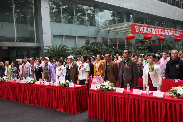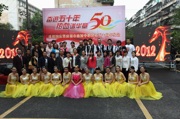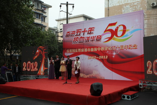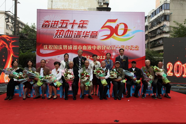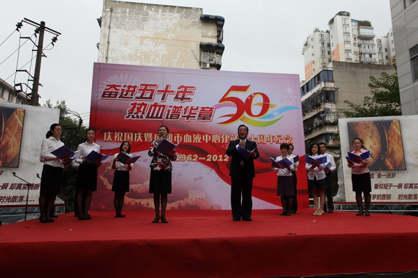 金秋时节,桂花飘香,国庆前夕的血液中心彩旗飘飘、大红气球高高飘扬,上上下下被打扮得喜气洋洋,像过节一样。9月25日下午,中心庆祝建国63周年和中心建站50周年大会在业务大楼前的空坝上隆重举行。参加庆祝大会的有成都市卫生局副局长刘培毅及办公室、医政处等处室负责人,中心历届老领导、离退休职工及全体职工。