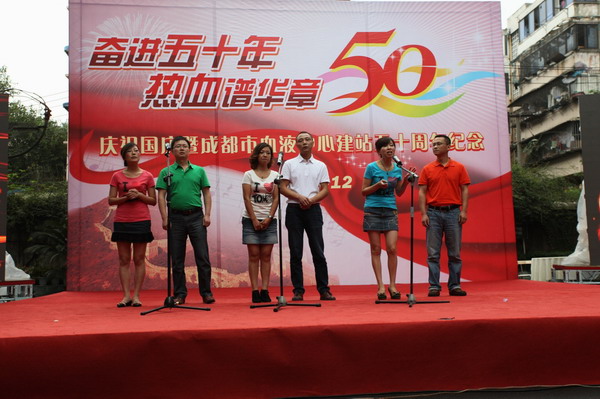 庆祝大会在雄壮的《国歌》声中拉开帷幕,中心党委书记杨群身主持大会,他向大家介绍了参加大会的来宾和庆祝活动的主要内容。随后,播放了中心精心制作的纪录片《热血50年》,该片全面反映和介绍了半个世纪以来中心从无到有、从小到大、从弱到强的发展历程,展示了几代血站人的奋斗史。随后,中心主任王乃红讲话,她代表中心党政班子领导向关心和支持血液中心发展的各级领导,向中心老领导、老同志和全体职工致以崇高的敬意和真诚的感谢。她表示,我们将以建站五十周年为新的起点,为成都市无偿献血事业的发展做出新的、更大的贡献。