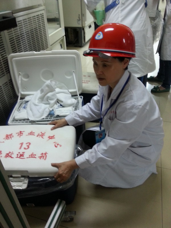为保证灾区伤员血液救治,在地震发生后立即对血液库存做了分析,与雅安血站取得联系,了解雅安血站的血液需求量,并及时与省卫生厅、成都市卫生局取得联系将相关血液保障情况进行了汇报。下午两点,由中心主任王乃红带队向雅安市中心血站紧急送血,共调拨红细胞悬液358.5单位,血浆37000毫升。同时,向陆军总医院血站调拨红细胞悬液120单位。晚上九点,又向雅安血站调剂RH阴性血4个血型共计8个单位。同时,按照卫生厅的要求,在中午12点前做好了全省血液救援数量统计等调剂工作,全省采供血系统也已经准备好了4000个单位红细胞悬液和65万毫升血浆随时调往灾区。