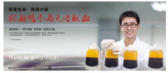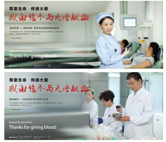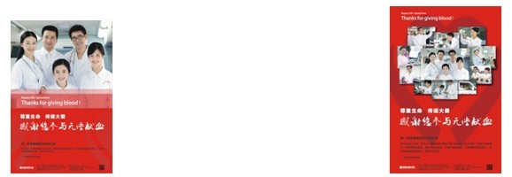 海报是开展无偿献血宣传的重要载体之一,目前全国无偿献血宣传海报较多采用明星担任形象大使倡导无偿献血理念,或漫画元素配以无偿献血知识等形式。成都市血液中心继2009年谭维维形象大使海报、2010年成都市电视台主持人形象大使海报之后,2013年首创以中心职工为原型拍摄并制作了系列宣传海报。