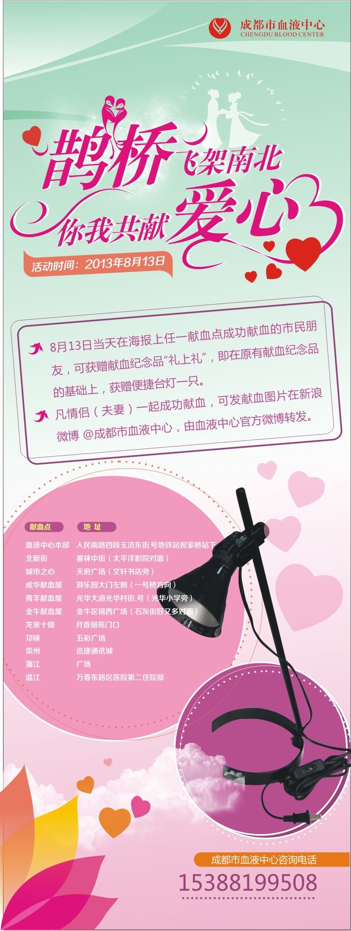 2013年8月13日又到七夕佳节时,成都市血液中心沿袭“传统”,再次举办了七夕节“鹊桥飞架南北你我共献爱心”无偿献血活动。作为已经连续多年举办的活动,每年中心工作人员都会悉心准备特别的献血纪念品,寄予“唯一”意义的玫瑰花、“特别”甜蜜的巧克力、充满“家味”的家庭实用物品小套装……今年,除了献血纪念品礼上礼外,还在中心新浪官方微博开展了“你@我转发”活动,只要献血情侣发送照片至新浪微博并@成都市血液中心,就可得到中心官方微博的转发,恋人牵手献血传递大爱,我们转发传递他们幸福的微笑。