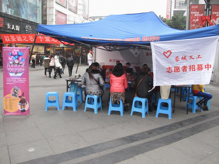 活动期间,成都的天气并不作美,淅淅沥沥下起了雨,使原本就寒冷的空气好像要凝固起来。街上的行人也一个个全副武装、行色匆匆。此情此景,采血队的工作人员却没有心灰意冷,拉横幅、摆展架……寒风中,献血点被有条不紊的布置起来,他们相信看到活动预告,接到活动短信的献血者一定会如约而来。不出所望,很快献血车(屋)都陆续迎来了献血者。而为活动特别准备的“圣诞礼物”则吸引了路人的驻足,加入到无偿献血的队伍中。献血者纯洁的爱心给这个凛冽的冬日带来了春天般的温暖。