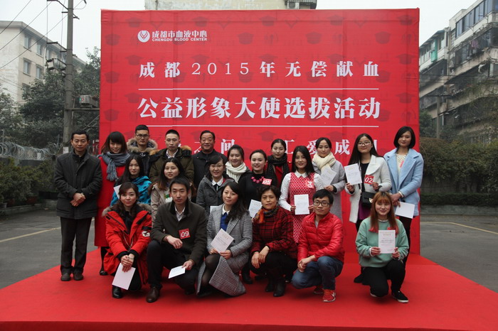 由成都市献血领导小组办公室主办,成都市血液中心承办的“成都市2015无偿献血公益形象大使选拔活动”自2014年12月20日正式上线。历时1个月,在广大市民、网友和专家评审组共同公开、透明的层层评选下,来自工人、农民、职员、师生、医务人员和公务人员6类群体的12位形象大使逐一产生,2015年1月18日评选阶段和主题海报定妆拍摄阶段已圆满落幕。