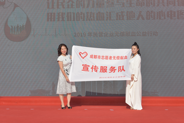 启动仪式上,成都市血液中心主任傅雪梅为新成立的“民企红领无偿献血志愿宣传服务队”授志愿者队旗,这支志愿者队伍是国内首支由民营企业家、企业协会组成的无偿献血宣传志愿者队伍,队长由本次民企公益行动的“热血带头人”、四川省无偿献血宣传大使碗均担任。碗均创办的企业是成都市唯一获得“全国无偿献血促进奖特别奖”的民营企业,她坚持14年定期带领员工献血的事迹感召和影响了在川企业家参与本次公益行动。