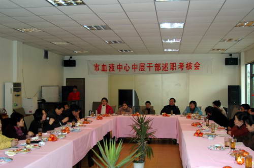 2006年1月20日,血液中心召开了05年度中干述职会。会上,中层干部们总结了过去一年的工作、提出了经验与不足,并对06年的工作进行了部署。会议由中心党委副书记刘迤同志主持,中心主任王乃红对中层干部一年的工作进行了评价,她认为这一批干部充满活力,工作中积极进取,敢于创新,办事讲效果、重合作,起到了良好的带头作用。最后,党委书记尹丹妮对述职考核会作了总结,肯定了中干们一年的工作成绩,对明年的工作提出了新的希望,要求大家再接再厉,团结协作确保血液安全,保证临床用血。