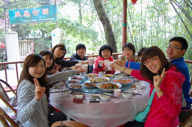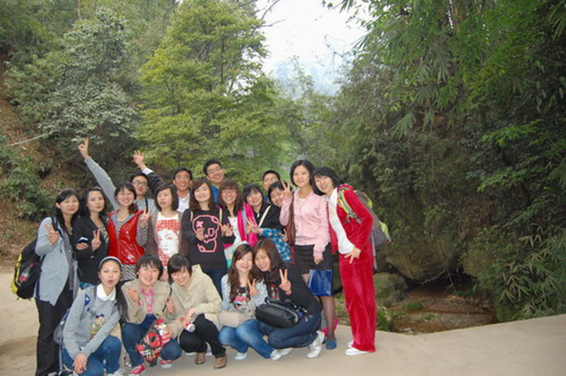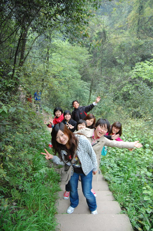 九点半,大家集合好就准时出发了,一路上共青团员们在车上唱着歌、玩着扑克,1个半小时的路途也在大家欢声笑语中轻松度过。在山脚下用过午餐,稍作休息后,惬意的登山活动就此开始了。刚到山口,山中的风景就把大家的眼球牢牢的锁住,青城外山虽没有青城前山的气势,但四川山峰特有的幽静和秀丽也让它别有一番味道。小径顺山蜿蜒而上,两旁翠绿的树木向四周漫无边际的伸展着,所有的一切透着安宁祥和的声息。湿润的空气伴着叶子的清香扑鼻而来,清爽而怡人。大家不时哼着歌曲,有说有笑得走在登山路上,偶遇好的风景,也都争相合影留念。此山不高,不到一个小时的时间,大家就开始下山,由于前几天下雨,泥路湿滑,并不好走,于是大家就充分发挥了团队合作的精神,一小部分团员走在前面探路,走出一条可以走的道路,后面的团员就手拉着手互相帮扶着一步一步小心翼翼的走下了山。虽然,道路崎岖难走,但是大家却在这互帮互助的氛围里体会到了更加珍贵的友谊。回到山口,大家稍显狼狈,鞋子上沾满了稀泥,但却纷纷感慨有这样的经历才是最值得回味的。