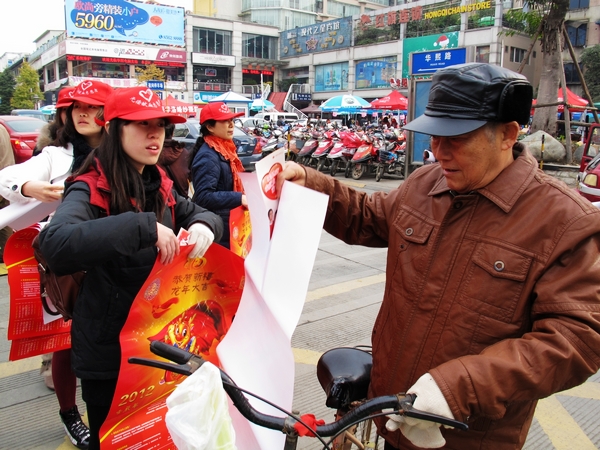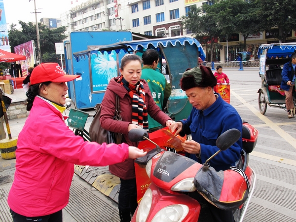 星期六,天气寒冷,忙碌了一周的人们都在休息,街上比较安静。但是严寒挡不住支部党员的热情,大家一大早就赶到中心大门口集合,统一乘车来到华阳镇最繁华的第V大道广场,戴穿好无偿献血宣传志愿者小红帽和红背心,拉开 “捐献可以再生的血液、拯救不可重来的生命”无偿献血宣传月活动主题横幅,走向人群,向他们发放无偿献血宣传资料和新台历、年历,并向他们宣传无偿献血知识,讲解用血优惠政策,宣传效果较好,很多人听了我们的宣传后就问献血时间、地点、优惠规定等,也许是马上要到新年了,我们新印制的无偿献血台历、年历非常受欢迎,市民们争先恐后领取。当天发放无偿献血资料300余份,台历、年历各100个。