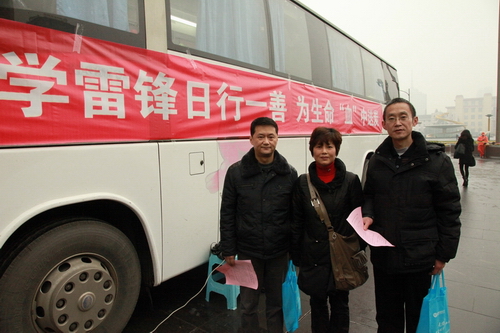 经过准备,3月1日上午,支部党员周健、周捷,一大早带着介绍信、宣传资料等,冒着大雨在3月5日中心准备开展学雷锋活动的“城市之心”附近,到机关、企事业单位、学校、公司等,开展上门宣传招募活动。我们到每一个单位都认真、热情的向他们宣传雷锋精神和无偿献血的重要意义,讲解无偿献血知识、用血享受的政策,进了一家又一家,不一会儿鞋子就被雨水打湿了,天气又冷、风又大,但是我们没有退缩,依然继续我们的活动。3月5日,周健、周捷和王刚又出门到各单位招募,在天府广场遇见青羊公安分局巡逻大队的警察正在举行活动,看见这么多年轻警察,我们马上走上去与他们负责人交谈、宣传,这位负责人说我经常献血,但是今天我们有活动,以后有机会一定组织人员来献血,我们就把献血宣传资料、联系方式等留下。随后我们来到陕西街,到几个省级机关宣传,一家很顺利,但是另外一家门卫就是不要我们进去,说了半天也不行,我们很无奈。然后我们来到中心在“城市之心”采血点开展的“学雷锋日行一善、为生命‘血’中送炭”活动现场,开展宣传、服务活动。