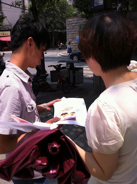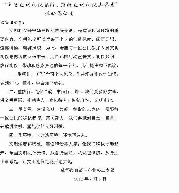 重自觉。建设文明、美好、和谐的大家庭,需要每一位公民的积极参与,共同努力。我们要做到自觉、自律,养成讲文明、重礼仪的良好习惯。” 大家积极的配合,3人一组分成几个团队,将宣传资料不断的发给过往的人群;有的市民热情的接过资料,细心阅读起来;有的只是微微一笑;有的主动过来取资料;当然也有的会摆手拒绝,我们的党员也不怕,会拿着资料反复介绍文明礼仪知识,直到他们离开……,今天天气虽然很热,但是从拿到的资料中津津有味读起来的市民脸上的表情,看得出他们对成都市逐渐形成的礼仪和文明感到一丝的欣慰,我们都会心的笑了。这次活动中,作为血液中心的一分子,我们也积极倡导市民参加无偿献血活动,耐心细致给市民讲解无偿献血的注意事项,派发无偿献血知识手册和小纪念品。通过宣传,市民在认知礼仪知识普及的过程中自身文明素质和修养也得到了提高,同时也对无偿献血事业有了更为深刻的理解,为创建文明城市奠定了坚实的基础。