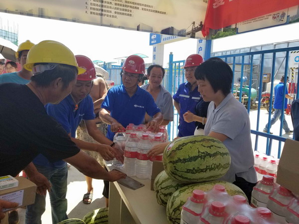 活动现场,中心党委书记米虹同志,中心党委委员、中心副主任邹雪川同志向施工人员发放了藿香正气液、清凉饮料、西瓜等防暑降温物品,并嘱咐他们在工作时要多饮水,注意防暑降温,同时感谢他们在酷暑天气仍然坚守施工一线,希望他们能够注意施工安全,严守施工工艺,保证工程质量。这些防暑降温物品真切表达了中心对施工人员的关怀。在场的施工人员都纷纷表示收到这些防暑降温物品,非常开心,也很感动,天气虽然炎热,但一定会克服困难,保质保量建好“新血站”。
