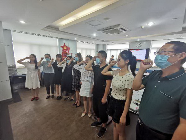 活动中,首先支部书记褚晓以“跟着党旗战斗、不忘守护人民的初心”为题和党员们分享了武汉抗疫期间涌现出的共产党员的典型事迹党课,激励和引领大家共克时艰、团结奋进。随后支部党员纷纷讲述自己在抗疫期间的心路历程,表示要以“不忘初心、牢记使命”为指引,用实际行动践行对党的承诺。最后在中心党委书记米虹的带领下,9名过“政治生日”的党员再次重温入党誓词,在党旗下庄严宣誓,激昂的宣誓激荡起了无穷的力量,让胸前的党徽变得更加熠熠生辉。