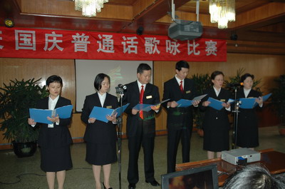 为了进一步开展第八届“推普周”活动,促进广大职工在使用方言的同时努力学习和自觉使用普通话,形成与社会发展相适应的良好语言环境。在国庆56周年即将到来之际,中心工会于2005年9月28日举办了“庆国庆普通话表演活动”。