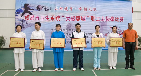 参赛队员利用工作之余,经过一个月的刻苦训练,于4月19日参加了成都市卫生局举办的卫生系统“太极蓉城”职工太极拳比赛。参加本次比赛共有28支队伍,经过紧张的角逐,我中心参赛队员以饱满的精神、整齐的动作、舒展的身姿,获得了比赛一等奖的好成绩。