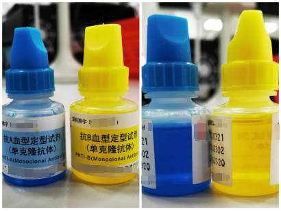 抗A试剂为蓝色澄明液体,抗B试剂黄色澄明液体