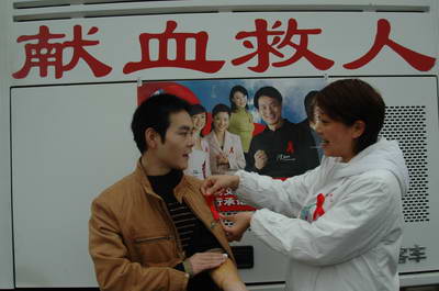 艾滋病宣传日 成都血液中心向献血者赠送红丝带
