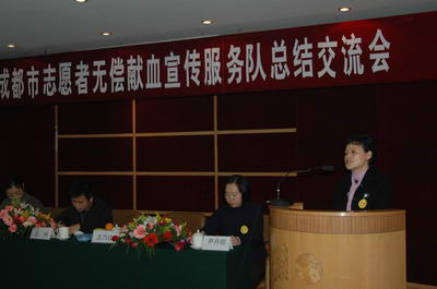成都市无偿献血志愿者服务队自2004年成立以来,已由当初的15支发展到28支,由300多人发展到近2000人,他们活跃在流动采血车旁、社区、公交车上、车站、农村、学校、街道,他们不计报酬,无私奉献自己的休息时间,为献血者服务、向公民宣传无偿献血的科普知识,招募自愿无偿献血者,正是在他们的努力和感召下,越来越多的公民加入到无偿献血的队伍中来,成都市连续两年取得的临床用血100%来自志愿无偿献血的显著成绩,都与他们的付出分不开。爱心大使分队、西南民族大学分队等在会上作了重点大会交流。大会还向服务工时100小时以上的志愿者颁发了荣誉证书。