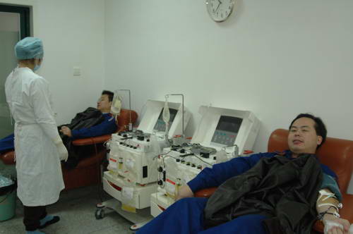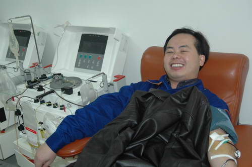 2006年12 月5日上午8:50时成都市血液中心机采室主任洪缨接到川医血库急需机采血小板的通知,立即与双流机场鹰联公司员工陈炯联系希望他能来血液中心捐献血小板。陈炯听说临床急需用血,立即找公司领导请假,没想领导一听献血非常支持,准假半天,还同意同事陈明开车送他。10:20时二陈来到血液中心机采室在工作人员的宣传鼓励下,陈明也加入了机采血小板体检,经体检合格两人一起捐献了血小板。笔者了解到24岁的陈炯是一个热血青年他献过全血二次、机采血小板3次,他说献血不伤身体,是一种社会责任。33岁的陈明在广汉献过全血,认为能把自己的血输给别人那种感觉真的很好。