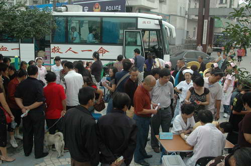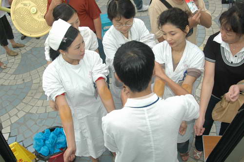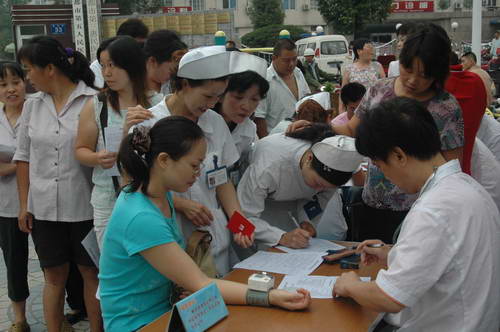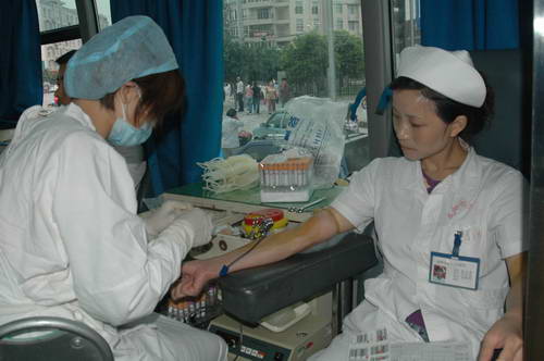 9月7日上午九时,成都市血液中心采血车开到成都市第五人民医院门口,早已在那里等候的医务人员排起了长队,填表、体检、献血,场面十分热闹。广场上还拉起了“无偿献血奉献爱心”的标语,有7、8个专家现场为市民义诊。成都晚报、四川电视台记者对医院红十字会会长陈学维进行了采访,陈学维说,最近看到媒体报道血库血液偏型,所以组织大家来献血,他还告诉记者,献血不影响健康,但血液却能挽救他人的生命,我们要以实际行动来号召更多的市民加入到无偿献血的行例中来。当天有116位医务人员献出了宝贵的血液。