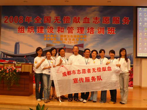 为促进我国无偿献血招募工作的可持续发展,提高各地无偿献血招募理论和技巧,2008年4月23―25日卫生部在深圳市召开了“全国无偿献血志愿服务组织建设和管理研讨培训班”,成都市共有6名代表(其中我中心工作人员两名,志愿者代表4名)参加这次培训班。
