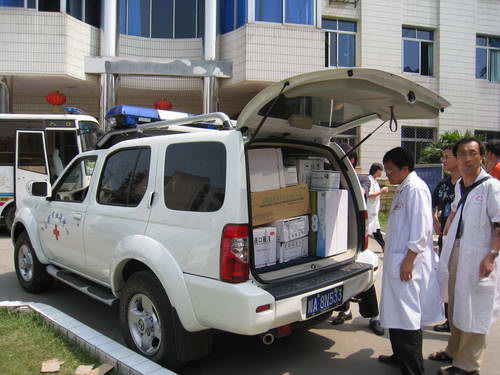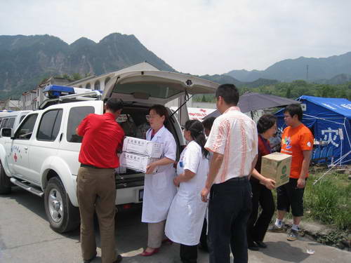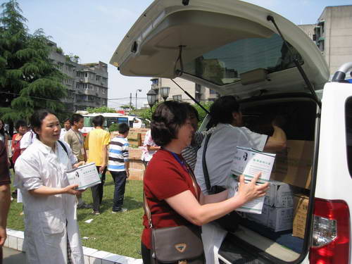 5月12日汶川发生8级特大地震,成都彭州市多个乡镇因紧靠龙门山脉,成为地震中受灾严重的地方。为抢救伤员,成都市血液中心彭州采血队的工作人员多日来奋战在抗震救灾的第一线,在保障临床用血的同时,还做好了赈灾药品的接收和调配工作。5月19日,成都市血液中心书记尹丹妮、副主任唐莉带着牛奶和矿泉水等物资前往彭州市慰问了彭州采血队的工作人员,并义务了承担运送药品前往重灾区的任务。